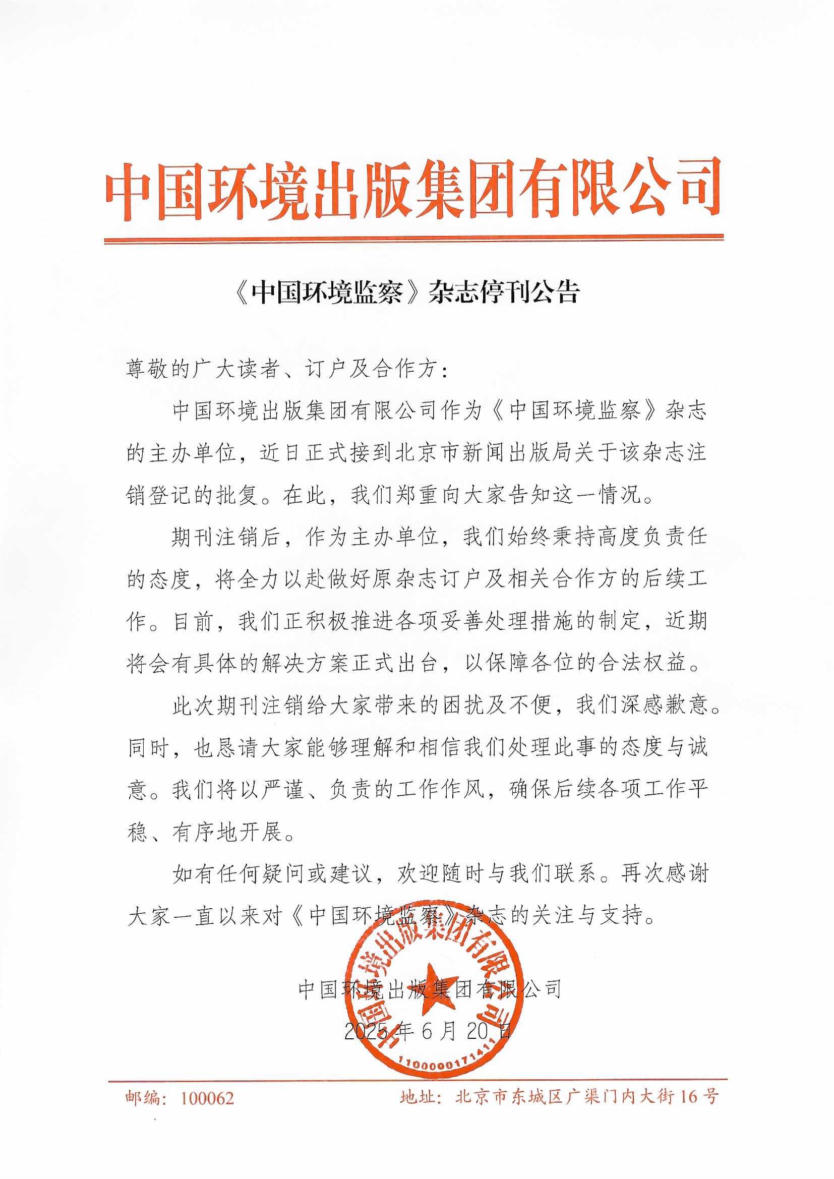 中國環境出版集團有限公司作為《中國環境監察》雜志的主辦單位,近日正式接到北京市新聞出版局關于該雜志注銷登記的批復。